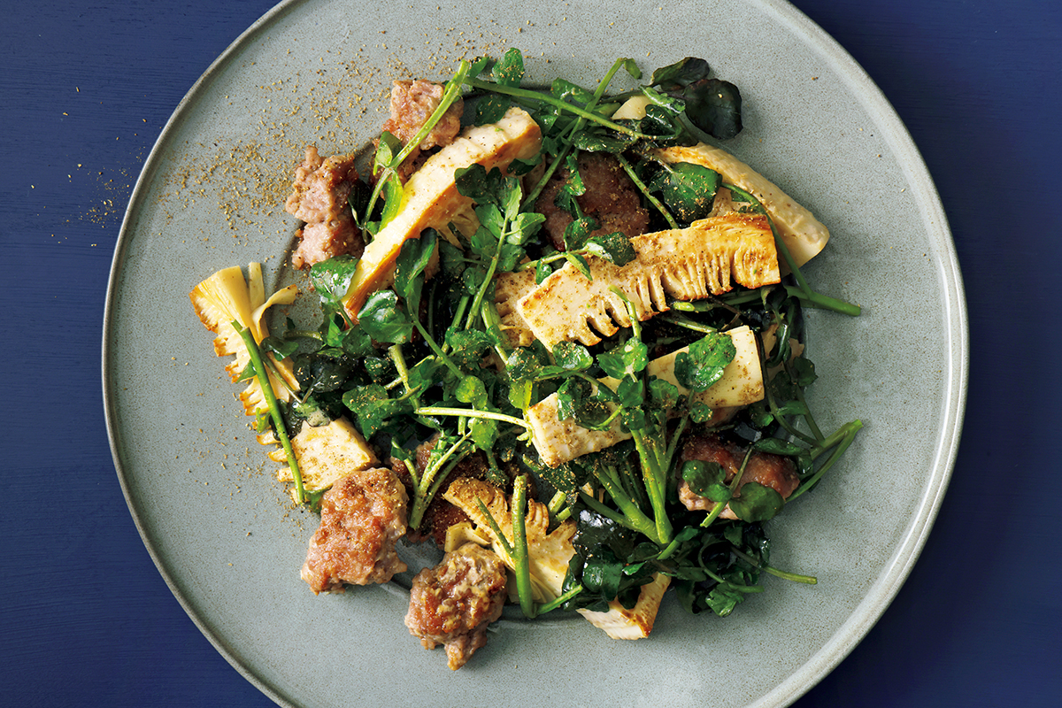 低温で火を通してジューシーな食感に。一度焼いてから、一晩漬け込みます。春菊とゴルゴンゾーラの2種のソースを添えて。(暮しの手帖 第5世紀39号「気楽なかたまり肉料理」より)