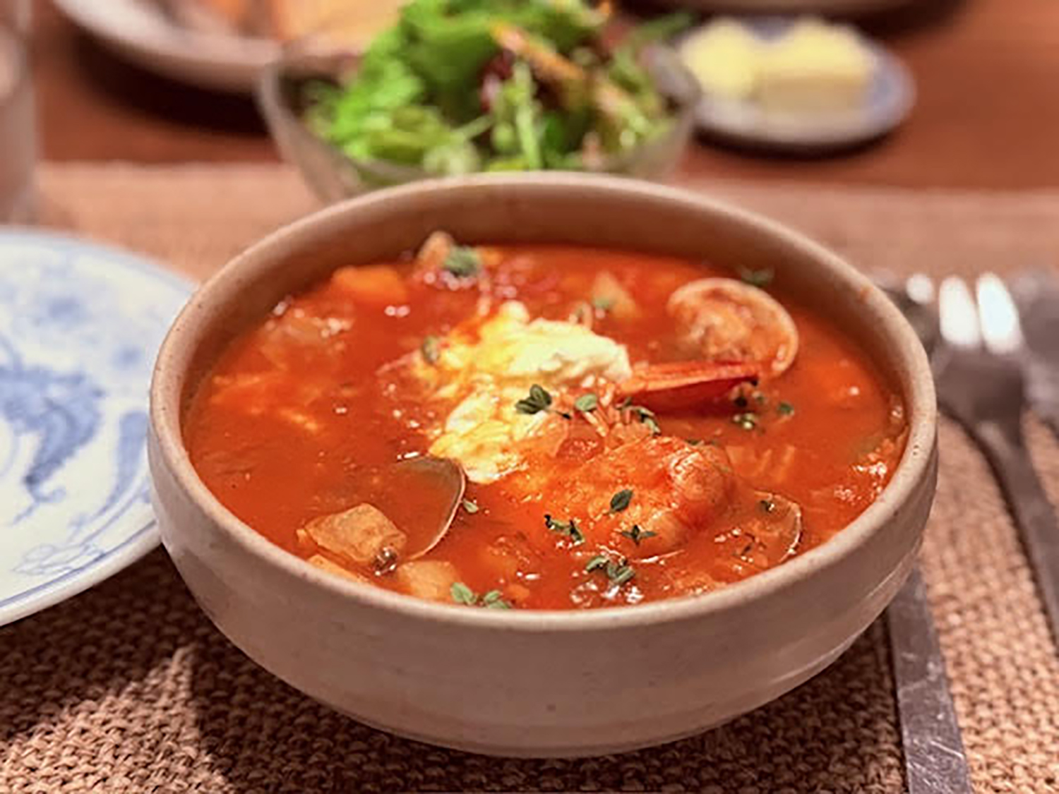 基本のクラムチャウダーは、ニューイングランド風もマンハッタン風も、炒めたべーコンを入れてコクを出すものが主流ですが、私の周りには肉類を食べない人も結構いるので、べーコンを入れないで作ることも多いです。けれどあっさりし過ぎないようにしたいなと考えていた時、パリに住んでいた頃に好物だったフランスの魚介スープ「ブイヤベース」を思い出しました。そこでコクを出すには白ワインと数種類の魚介類を入れたら良いかも? と思い、アレンジしているうちにわが家風のレシピが出来上がりました。