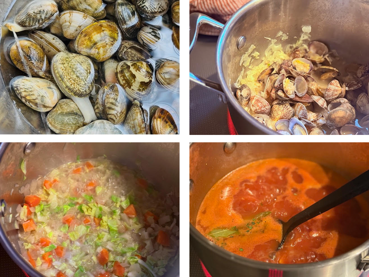 ところで、アメリカ発祥のクラムチャウダーは2種類あることをご存じでしょうか? 一つはニューイングランド風と言われる牛乳や生クリームを加えた濃厚な味わいの白いチャウダーで、もう一つはマンハッタン風のトマトベースにタイムの風味が爽やかな赤いチャウダーです。どちらも好きで時々作るのですが、どちらかというとニューイングランド風はだんだんと寒くなってくる秋に食べたくなることが多いので、今回はこれからの季節に合うマンハッタン風をアレンジした魚介のチャウダーをご紹介しますね。