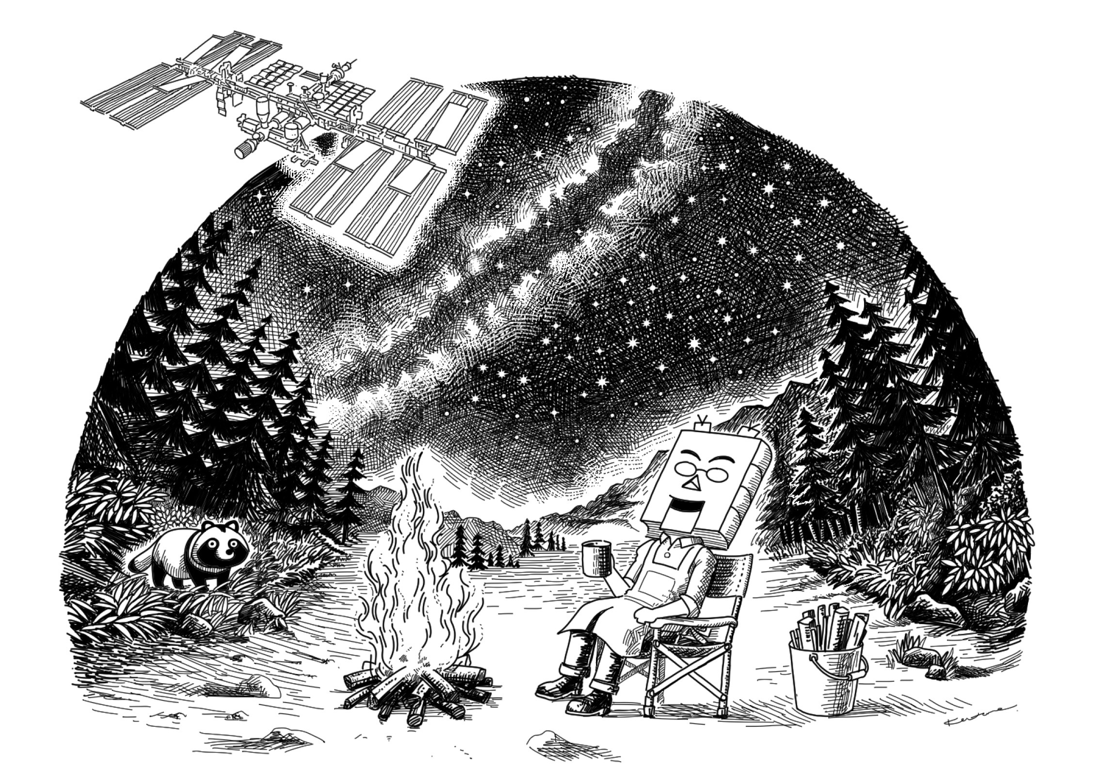 狙っていた夜があるんです。僕が好きな天体イベント、国際宇宙ステーションの通過です。国際宇宙ステーションは、地上約400km上空を、時速約2.8万kmで周回する、サッカー場ほどの大きさの巨大な有人実験施設です。今もここで、宇宙飛行士たちが、さまざまなミッションをおこなっています。そんな国際宇宙ステーションは、動く星として、肉眼で見ることができます。明るさは、一番明るい一等星よりも、さらに明るいです。約90分で地球を1周するほどの高速で移動していますから、あきらかに他の星とは動きが違います。光の点が、スーッと夜空を通過するんです。