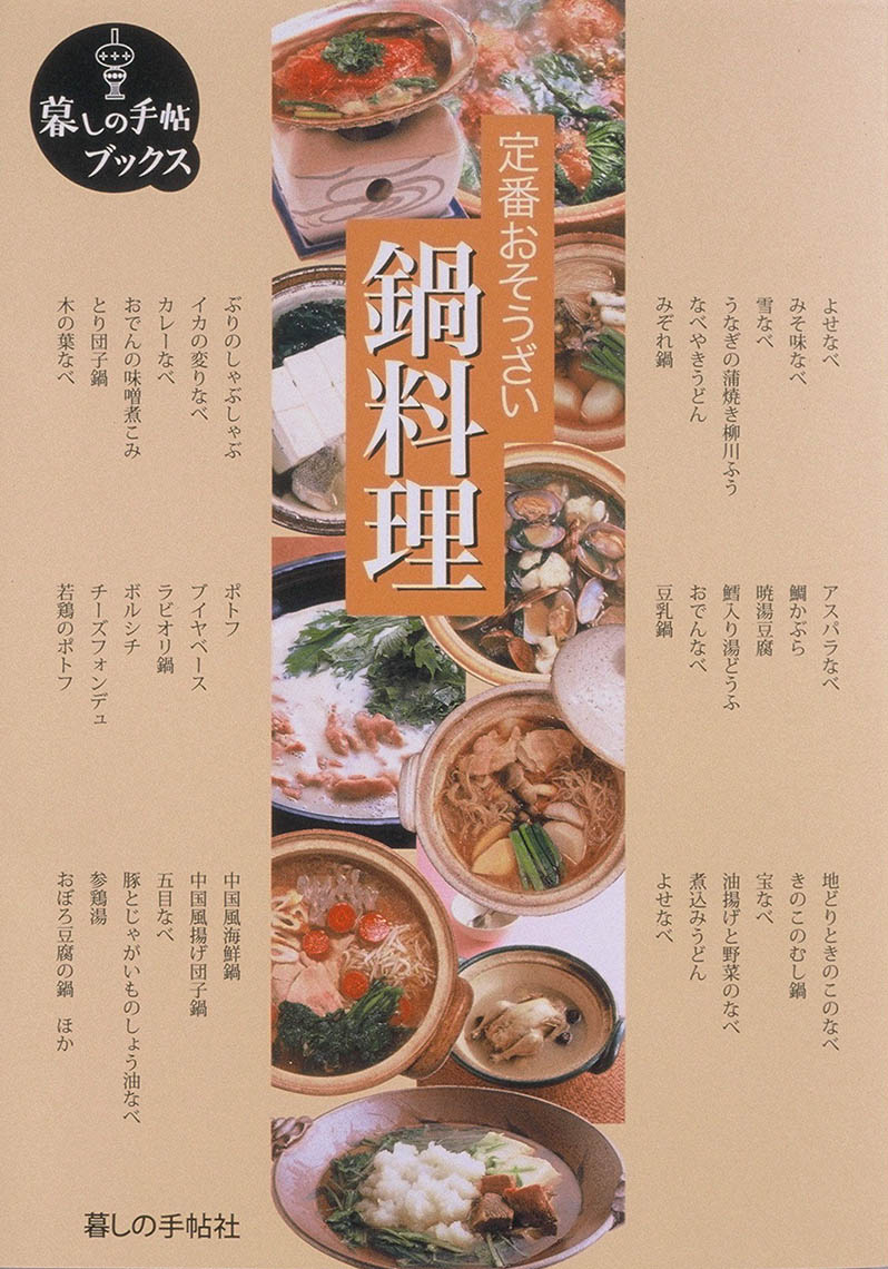 豚肉ともやしのなべ/よせなべ/野菜なべ/みそ味なべ/雪なべ/うなぎの蒲焼き柳川ふう/なべやきうどん/みぞれ鍋/鴨と秋野菜のみぞれ鍋/きりたんぽ鍋/トリの野菜なべ/かきの土手なべ/蛤なべ/アスパラなべ/鯛かぶら/暁湯豆腐/鱈入り湯どうふ/おでんなべ/豆乳鍋/かきと鱈の豆乳鍋/うなぎの蒲焼き鍋/沖すき/魚すき/鴨とトリのつくねなべ/松茸とはものしゃぶしゃぶ/松茸とはものなべ/あさりとカリフラワー/しじみのしゃぶしゃぶ/いわし団子のみぞれなべ/合鴨のハリハリ鍋/地どりときのこのなべ/きのこのむし鍋/宝なべ/油揚げと野菜のなべ/煮込みうどん/よせなべ白味噌仕立て/ぶりのしゃぶしゃぶ/イカの変りなべ/カレーなべ/おでんの味噌煮こみ/とり団子鍋/木の葉なべ