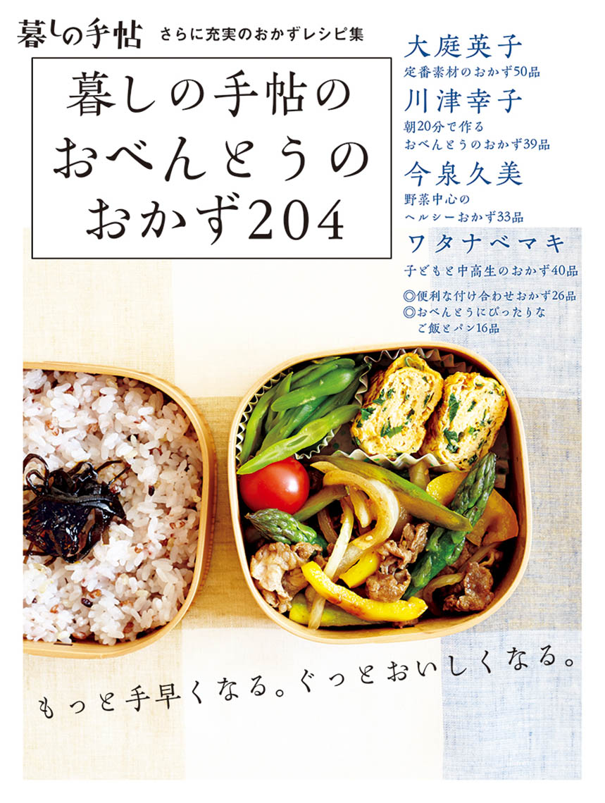 暮しの手帖別冊『おべんとうのおかず204』(2015年刊)を、そのままの内容で書籍化しました。料理家の大庭英子さん、川津幸子さん、今泉久美さん、ワタナベマキさんに教えていただいた、手早く、おいしく作れるおかず全204品をご紹介しています。