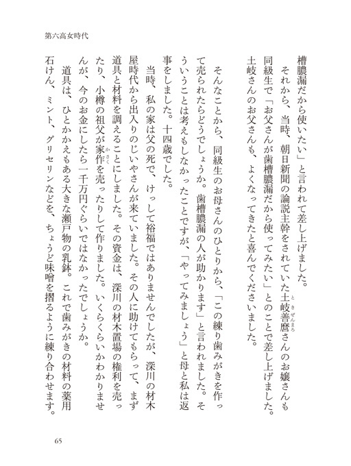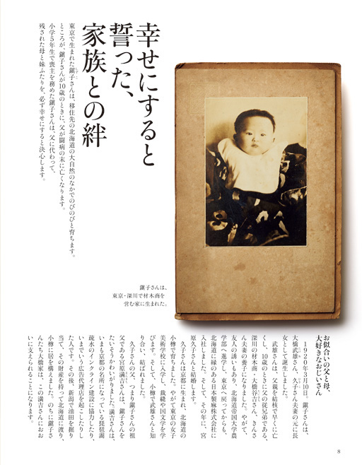 1920(大正9)年3月10日、鎭子は東京・深川で大橋武雄と久子の長女として生まれました。次女・晴子、三女・芳子の三人姉妹。父親を早くに亡くした鎭子は、わずか10歳で喪主を務めます。「お母さんを助けて、妹の面倒をみるように」という父の遺言どおり、家族をしあわせにしなければ、と心に誓いました。女学校時代を、ユニークな教育で知られた東京府立第六高等女学校で過ごし、卒業後、日本興業銀行を経て、日本読書新聞社に勤務しました。
