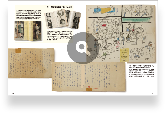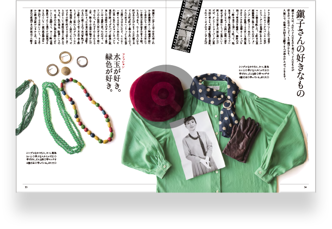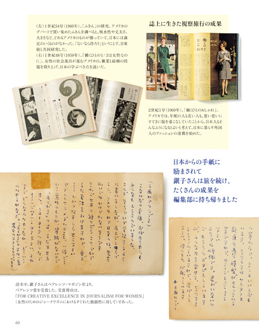 鎭子はかねてから「女の人をしあわせにする雑誌をつくりたい」という志があり、花森安治の協力を得て、1946(昭和21)年に「衣裳研究所」を設立、女性のための服飾雑誌『スタイルブック』を創刊。初代社長として経営にあたりながら、花森編集長のもと編集にも携わります。1948(昭和23)年、雑誌『暮しの手帖』を創刊し、のちに社名を「暮しの手帖社」に変更。広告を排除し、衣食住をテーマにした誌面づくりで、読者から高い支持を得ました。1958(昭和33)年には、アメリカ合衆国国務省の招待で4カ月間の視察旅行に出かけます。ニューヨークのペアレンツ・マガジン社より、雑誌を通じた子どもや家庭への貢献が評価され、旅中に「ペアレンツ賞」を授与されました。1969(昭和44)年、『暮しの手帖』第2世紀1号より「すてきなあなたに」の連載を始めます。確固たる哲学と美的センスを貫いた花森とは対照的に、日常のささやかな出来事や暮らしへのこまやかな愛情を綴りました。1994(平成6)年、同エッセイにより東京都文化賞を受賞。