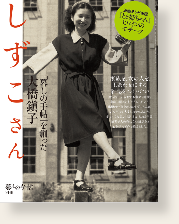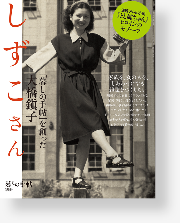1978(昭和53)年に花森が没した後もその意志を継ぎ、人々の暮らしに役立つ雑誌であり続けたいと願って、経営と編集に尽力。93歳で亡くなる1年ほど前まで、朝9時から夕方5時半の勤務を続けました。2013(平成25)年3月23日、肺炎のため永眠。もちまえの活発さと勇気で昭和を駆け抜け、生涯を出版業に捧げました。その人柄と情熱は人間味にあふれ、社員はみな家族のように親しみをこめて「しずこさん」と呼びました。